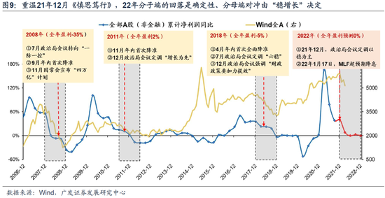 22年分子端业绩回落是确定性(参考08/11/18年)。22年A股盈利进入自周期高点向下回落的第二年,A股非金融盈利增速或降至低速个位数增长,这是分子端的确定性;参考历史上盈利周期向下回落的第二年(08年、11年、18年),历史上的可比周期A股市场往往因为分子端担忧而承压。