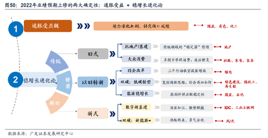 22年把握不确定中的确定性,聚焦业绩预期上修的两条线索——通胀受益链、以及“稳增长进化论”。
