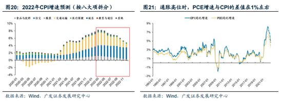 预计2022年底美国CPI同比增速约为4.7%,PCE同比增速约为3.6%。2022年美国CPI同比增速高点在3月,随后CPI同比增速是持续回落的趋势,年底大约在4.7%。2022年底PCE同比增速约为3.6%。从历史数据来看,PCE与CPI同比增速的走势一致,幅度的差值与通胀的绝对水平有关。基于对CPI增速的预测,我们认为PCE增速全年高点也在3月出现,年底大约为3.6%,低于美联储3月公布的预测值(4.3%),但仍远高于目标水平(2%)。因此,如果美国经济衰退风险可控,2022年美联储较难转相对鸽派。