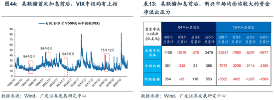 美联储加息对全球风险偏好产生扰动。历史上来看,美联储初次加息前后,对发达市场风险偏好造成冲击,新兴市场资金面临净流出。(1)发达市场:1990年以来,美联储首次加息前后,美国标准普尔500波动率指数(VIX)中枢均阶段性上行,发达市场风险偏好受到冲击。(2)新兴市场:2000年以来的2次美联储首次加息前后,新兴市场、中国内地、中国香港均面临较大的资金净流出压力。尤其在加息前后共半年的时间内,全球资金对新兴市场的偏好有极为显著的下行。