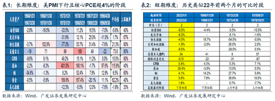 而短期维度来看,类似22年1-2月,时间区间在2个月+美国加息周期+利率上行+期限利差收缩+大宗商品快速上行+通胀高企+PMI下行+股票市场调整的区间,主要有3段:1968.11-1962.1、1973.2-1973.4、1978.8-1978.10。其中,1968.11-1962.1这一区间处在美股盈利下行的初期,与当前阶段极为类似。当前,美股盈利下行、PMI下行、全球通胀高企,而美联储3月议息会议更是显着下调了2022 年的 GDP 增长预测,“滞胀”特征愈发凸显。