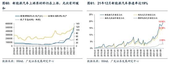 新能源车上游原料高价延续,下游渗透率斜率引忧。第一,锂矿资源紧缺导致碳酸锂开工率大幅下降,截至3月初,新能源汽车上游碳酸锂价格为49.5万元/吨,较上月同期再上涨35.99%,原料价格约2年左右完全传导至下游整车环节(碳酸锂涨价从21年初起),目前特斯拉、比亚迪等下游车企均已承压开始涨价;第二,新能源车渗透率去年由4%涨至19%,2025年规划目标为20%,加上22年为补贴退坡延后的最后一年,预期政策驱动将有所放缓。