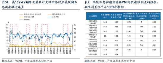 参考PMI的水平来看,此轮加息周期中期限利差收窄140BP以上才可能预示美联储加息接近尾声,但是考虑到加息初期就出现高PMI与低期限利差的组合,以期限利差的水平来看可参考1999年的情况。因此,未来若期限利差收窄至-40BP时,我们认为便可交易美联储收紧周期即将结束。