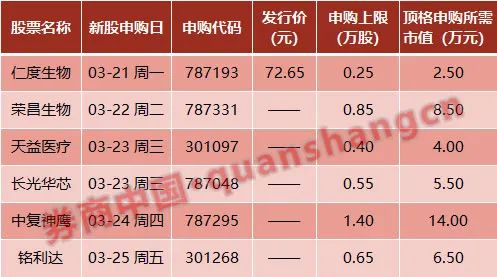 本周共有6只新股发行。3月21日发行的是仁度生物;3月22日发行的是荣昌生物;3月23日发行的是天益医疗、长光华芯;3月24日发行的是中复神鹰;3月25日发行的是铭利达。