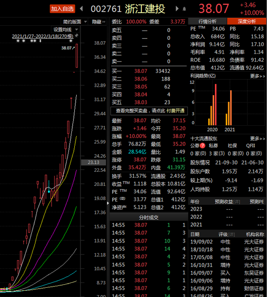 2月以来,浙江建投堪称A股“最靓的仔”。25个交易日收获16次涨停,涨幅高达386.21%,股价从最低的8元/股涨到最新的38.07元/股。