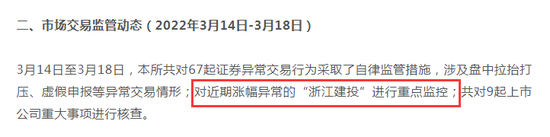 短时间的暴涨,浙江建投也多次受到监管关注。3月18日晚,深交所在其公众号发布的深市监管动态中表示,对近期涨幅异常的“浙江建投”进行重点监控。