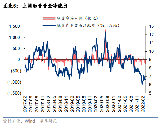 2022年3月16日当天,融资买入额占A股成交额比重从前一交易日的6.32%上升至当日6.69%,当日融资净流出约43亿,相比前一日的净流出124亿有收窄;第二个交易日(3月17日)融资买入额占A股成交额比重小幅上升至6.75%,融资继续净流出42亿。