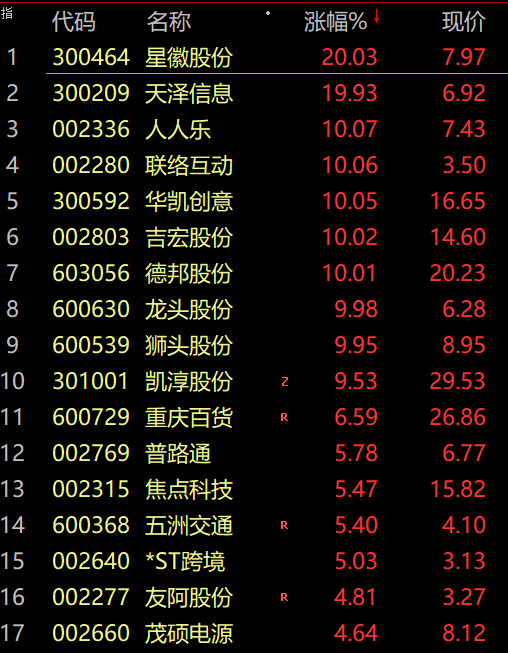 小家电板块、电商概念股震荡走高,创业板股天泽信息、星徽股份涨停,凯淳股份涨超10%,富佳股份、比依股份、联络互动(维权)等涨停,奥佳华、北鼎股份、南极电商、壹网壹创、焦点科技等跟涨。