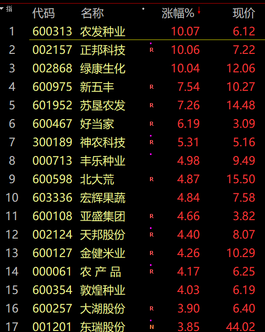 农业股盘中走强,农发种业涨停,金健米业、新赛股份、苏垦农发、亚盛集团、敦煌种业、万向德农等涨幅居前,近日,农业农村部、财政部明确2022年粮食生产重点工作及一揽子支持政策,2022年中央财政将综合实施补贴、奖励、金融等一揽子政策措施。天风证券分析称,地缘冲突、通货膨胀、气候变化等多重因素影响粮食可贸易量。