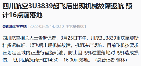 3月25日,有网友反映,四川航空3U3839次航班从重庆江北机场起飞后,半路折返,在重庆周边的上空盘旋。