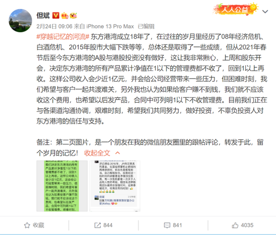 不过此后,但斌宣布,公司所有累计净值低于1元的产品,将不再向投资人收取管理费,待净值回到1元以上再收取。