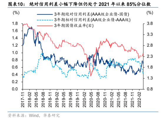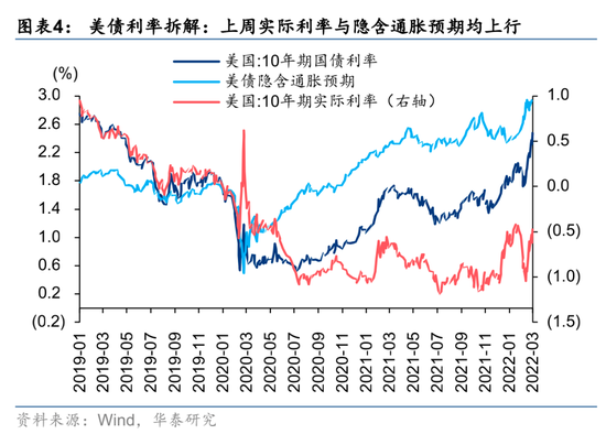 海外方面,美债10年期利率升至2.48%,由通胀预期和实际利率共同推升;美债期限利差(10年-2年)收窄至0.18%,临近倒挂;黄金、大宗商品、美元指数、美股特别是纳指同涨,整体预期较混乱。国内方面,期限利差自2.15以来持续收窄,信用利差位于去年以来85%分位数,中美利差继续收窄至19年3月以来最低水平,若Q1末Q2初美国CPI同比阶段性回落而国内CPI同比因基数回升,中美实际利差将边际收窄。内外综合流动性环境仍然中性,不支持A股强势反弹;但资源与产能比美元更短缺、中美实际利差的中枢大概率维持高位,意味着A股当前所处的底部区域较为坚实。