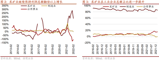 从营业收入利润率的角度来看,根据国家统计局的数据计算,制造业营业收入利润率1-2月为5.2%,较2021年12月下滑1.1个百分点,采矿业营业收入利润率为24.5%,为2021年10月以来次高值。公用事业整体营业收入利润率为2.8%。上游采矿业利润率显著高于制造业。