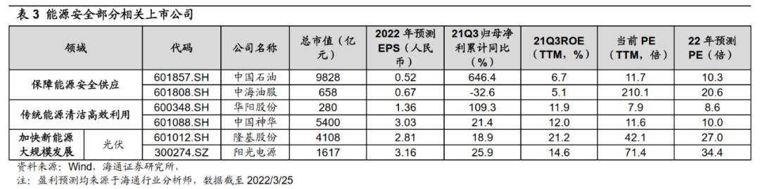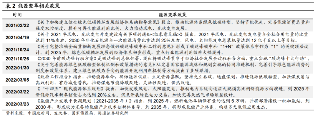 为保障能源安全,政策举措陆续出台,具体有以下三个方面:①保证能源供应稳定。全国能源工作会议提出,2022年要全力保障能源安全,有效发挥煤电基础性调节性作用,持续提升油气勘探开发力度。1月发改委等部门也发布《关于完善能源绿色低碳转型体制机制和政策措施的意见》,提出要健全能源供应保障和储备应急体系,统筹能源绿色低碳转型和能源供应安全保障。②大力发展新能源。2月国务院发布的《关于加快建立健全绿色低碳循环发展经济体系的指导意见》和 3月能源局的《“十四五”现代能源体系规划》共同要求加快推动能源绿色低碳转型,加快发展风电、太阳能发电。3月23日出炉的《氢能产业发展中长期规划(2021-2035年)》指出氢能产业是战略性新兴产业和未来产业重点发展方向。③提高能源科技水平。20年12月国务院发布的《新时代的中国能源发展》白皮书就强调了要促进数字化、大数据、人工智能技术与能源清洁高效开发利用技术的融合创新,推动能源技术革命。今年3月能源局发布的《“十四五”现代能源体系规划》再度强调要增强能源科技创新能力,对加快能源产业数字化智能化升级和完善能源科技和产业创新体系等方面也作出了具体部署。