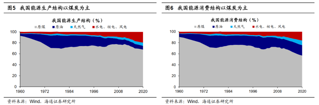 从资源禀赋上看,我国富煤、贫油、少气。我国煤炭资源储量丰富,根据经济日报的数据,煤炭占我国已探明化石能源资源总量的94%左右,远大于石油和天然气资源量。根据《BP世界能源统计年鉴》,20年我国煤炭储量为1432亿吨,占全球比重达13.3%,仅次于美国(煤炭储量占比为23.2%)、俄罗斯(15.1%)和澳大利亚(14.0%)。但我国人均煤炭资源不高,人均煤炭资源储量为99.5吨,低于全球人均的137.8吨,更远低于美国的人均752.1吨。同时我国煤炭资源在区域分布上北多南少,90%的煤炭资源分布在生态环境脆弱地区,煤矿开采难度大、成本高,2018年我国矿井平均开采深度达510米,露天矿产量仅占16.3%,而美国矿井平均采深仅90米,露天矿产量占65%。