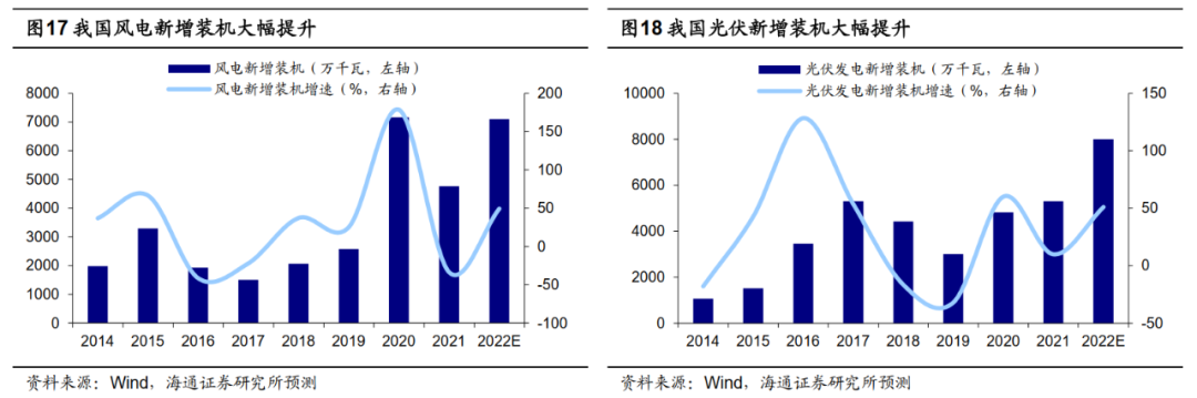 ③加快新能源大规模发展。随着产业技术进步、效率提升,近年来新建光伏发电、风电项目成本不断下降,当前已经具备平价上网条件,这将有利于风电和光伏等清洁能源推广。政策支持下,沙漠戈壁荒漠地区大型风电光伏基地建设正在提速。根据海通电新分析师预测,2022年我国风电新增装机有望在71GW以上,同比增长约50%,2022年我国光伏新增装机有望达80GW,同比增长超50%。随着风电光伏建设的提速,新能源消纳规模不断加大,新型储能也将迎来发展的重要战略机遇期。发改委和国家能源局提出2025年新型储能装机规模将达30GW以上,而21年新型储能累计装机仅4GW,储能领域也将持续受益。光伏建议关注隆基股份、通威股份、阳光电源、晶澳科技、天合光能;风电建议关注东方电缆、大金重工;储能建议关注英维克。