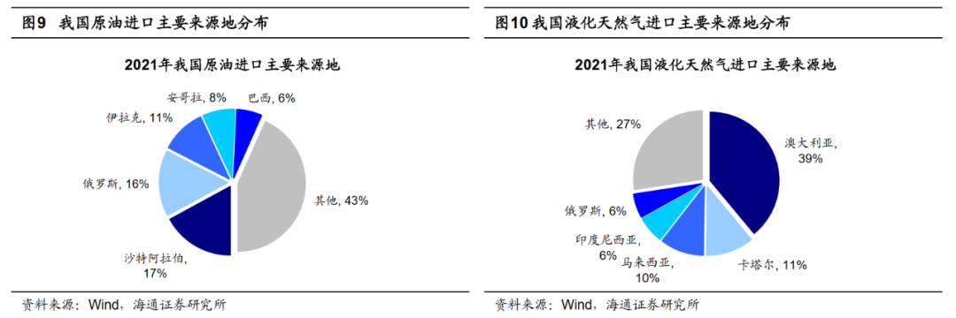 复杂国际形势是能源安全的外部威胁。石油和天然气是我国当前阶段的重要能源,油、气安全是能源安全的核心。当前逆全球化思潮不断蔓延,特别是疫情发生以来,全球产业链供应链多环节受阻,各国之间缺乏互信与合作,导致保护主义进一步成为主流。近期,地缘政治事件进一步加剧了主要国家的纷争和对立。正如前文所述,我国油、气对外依存度不断攀升,加剧了能源供应安全层面的挑战。从进口来源构成看,我国原油进口主要来自中东、非洲和俄罗斯,分别占21年原油进口总量的51.2%、15.5%和7.6%;液化天然气进口主要来源于澳大利亚、东南亚和中东,分别占21年天然气进口总量的39.5%、16.9%和13.3%。因此,我国油气通道较为集中,且海上通道占比较高。来源于中东、非洲和东南亚的油气均通过途径马六甲海峡的海上通道运往我国。在当前全球地缘政治紧张、全球范围内博弈加剧的背景下,油气资源的对外依存度带来的供应不确定性加剧。此外,油、气这类大宗商品交易遵循着“东方交易、西方定价、美元计价、期货基准”的格局,我国缺乏定价权,这严重影响产业发展、经济安全与国际竞争力。
