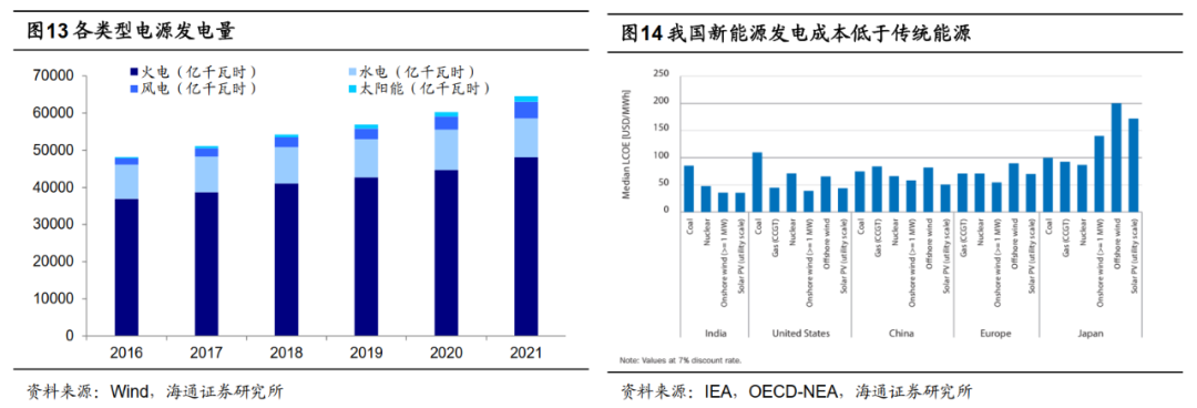 新能源尚不足以替代传统能源体系。当前我国新型能源体系发展已经取得较大进步,但相较于传统能源规模仍小。从能源消费结构看,2020年煤炭消费占能源消费总量比重为56.8%,比2019年降低1.6个百分点;天然气、水电、核电、风电等清洁能源消费量占能源消费总量比重为24.3%,比2019年提高4.3个百分点。2020年我国非化石能源发电装机容量达到9.8亿千瓦时,占总装机发电量的44.8%,比2019年上升16.8%。从汽车消费结构看,2021年我国新能源车销量达350.7万辆,2022年2月新能源车渗透率上升至19.2%。从发电量来看,当前我国火力发电依旧占据主导地位。2021年,我国火电发电量为48060亿千瓦时,占总发电量70.6%,水电、风电、太阳能分别占比15.5%、6.5%、2.2%。近年来虽然新能源发电成本降低,但由于新能源发电具有随机性、波动性和间歇性特征,在当前技术水平和应用规模之下,难以成为支柱能源体系。首先,光伏、风电的发电量受天气、昼夜等因素影响,具有随机性、波动性的特点。新能源高比例并网将导致电力平衡较为困难,将导致发电波动大幅增加,增加了维持电力平衡的难度,对电网的调峰能力提出更高要求。第二,新能源发电需配合储能技术使用,目前储能技术限制多、成本高。抽水储能和电化学储能是目前最为重要的储能方式、抽水储能尽管具备成本低和转换效率高的优势,但高度依赖于选址环境、地形条件,且建设周期较长。而电化学储能目前成本依然偏高。