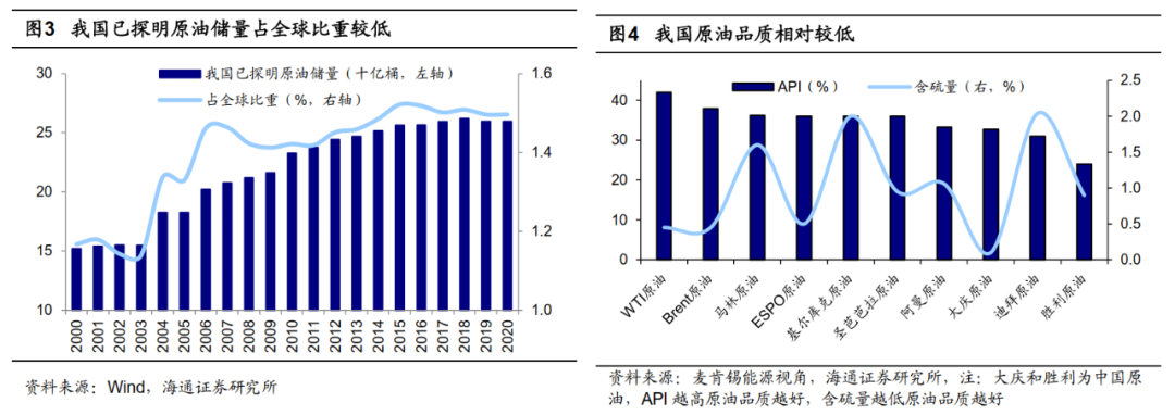 我国原油、天然气资源贫乏。天然气方面,从已探明储量来看,2020年我国天然气储量较2000年增长了5倍,但占全球储量的比重仍然不足5%。原油方面,从已探明储量来看,2020年我国原油储量259.6亿桶,排全球第13位,但占全球储量的比重不到2%。从原油开采来看,我国石油埋藏较深,加之地形复杂,开采难度较大。从原油品质来看,一般通过API来衡量原油品质,API数值愈大,表示原油越轻,品质越好。WTI原油API为42%,Brent原油API为38%,而我国大庆原油API小于35%,属于中质原油,胜利原油API小于26%,品质相对更低,后续冶炼成本也会相对较高。