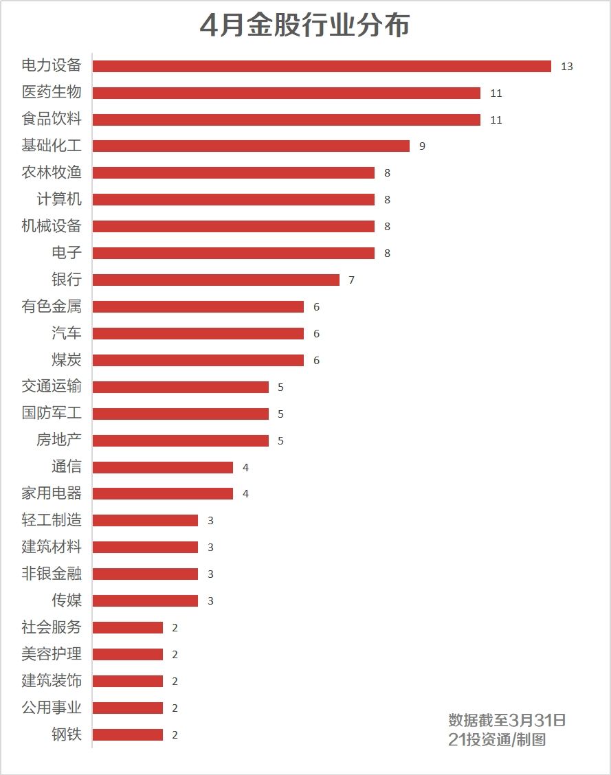 据21投资通不完全统计,截至3月31日,已有17家券商公布了4月金股,146只A股入选。