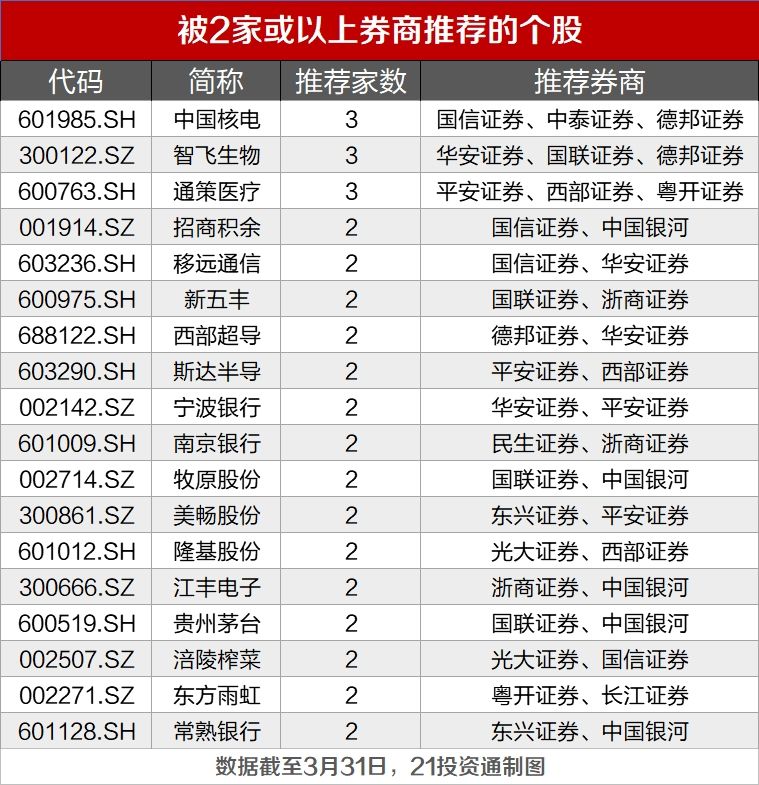 通策医疗、智飞生物、中国核电均被3家券商同时推荐。此外,涪陵榨菜、贵州茅台、隆基股份、牧原股份、斯达半导等15股均获2家券商推荐。