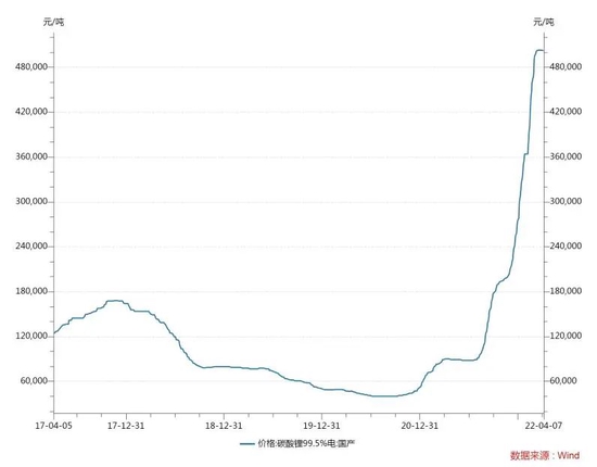 据悉,2021年初,碳酸锂的价格不足5万元/吨;到2022年初价格涨到25万元/吨。今年第一季度末,已经突破50万元/吨,碳酸锂最大涨幅超过10倍。