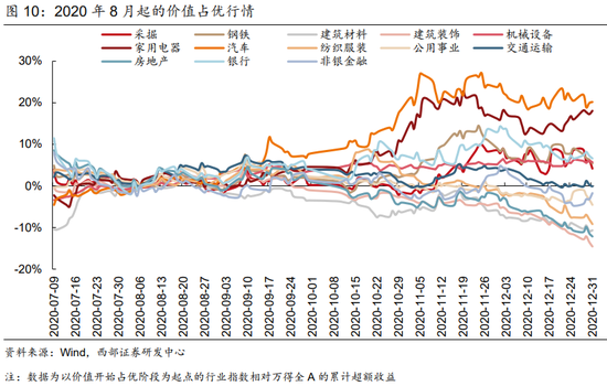 2020年8-11月市场宽幅震荡格局下,价值风格走势相对稳健。2020年7月市场快速冲高后进入震荡格局,价值风格开始走出稳健的超额收益。2020年下半年,我国汽车和家电销量在国内和出口需求的拉动下持续上升,在基本面支撑下汽车、家电等价值类行业迎来补涨行情。相比之下,成长板块并非没有机会但行情波动较大,行业层面受机构青睐的食品饮料、电气设备等核心赛道开始走强。