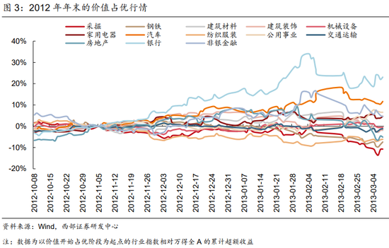 2012年11月至2013年2月A股先抑后扬,经济复苏与政策放松背景下银行领涨。2012年国内经济延续2011年的颓势,尽管经济刺激政策不断出台,但5月开始A股一路下跌。2012年四季度伴随降准降息与基建政策落地、地产政策微调,经济也出现复苏迹象,2012年11月中共十八大召开,市场改革预期强化,地产产业链(主要是房地产与家电)与银行板块迎来拉升。12月市场开始反弹,银行继续保持领先并一直持续至2013年1月末,在价值占优行情的中后期汽车、非银金融等行业也出现明显走强。2013年2月A股市场开始下跌,政策释放去杠杆信号,房地产政策开始收紧,2月20日国常会提出继续做好房地产市场调控工作,3月1日“国五条”出台,本轮以地产与银行为首的价值风格超额收益就此终止。