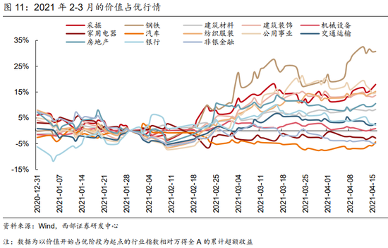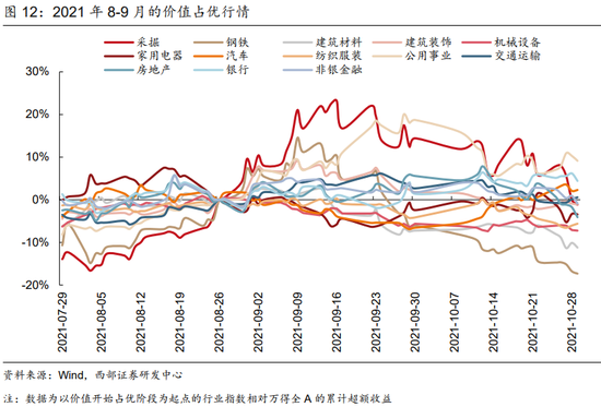 2021年1-3月及8-9月市场发生高低切换,估值压力消化后行情步入尾声。2021年初A股迎来躁动行情,但随着1月末开始美债收益率快速上行,流动性收紧预期升温对高位成长股形成系统性估值压力,蓝筹股的“抱团瓦解”带动市场休整。随着茅指数见顶,银行、钢铁、建材、采掘与公用事业等板块相继走强。在悲观情绪得到极大程度宣泄后,3月市场企稳上攻,叠加全球流动性维持宽松且高估值龙头个股估值逐步回归至合理水平,价值风格占优行情也步入尾声。在共同富裕政策趋势下,针对教育培训行业重磅政策出台以及互联网反垄断政策导致2021年7月26-27日A 股市场经历了急跌,前期估值偏高的板块显著调整。8月市场开始修复,但伴随着主流资金风险偏好整体回落,市场高低切换格局下价值风格逐步占优,叠加能耗双控的影响,钢铁、采掘、公用事业率先走强,不过随之而来的周期风格的见顶与成长风格的反弹中止了这段价值占优行情。