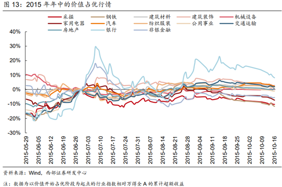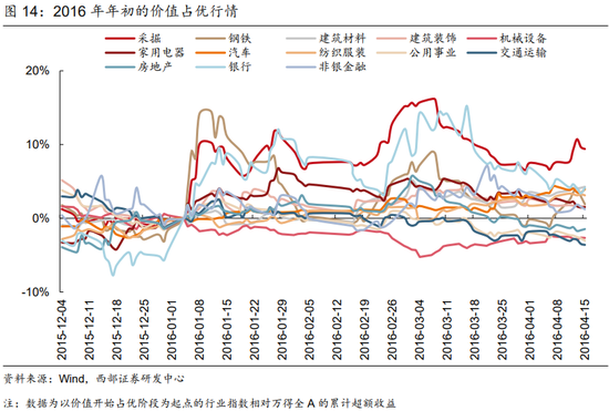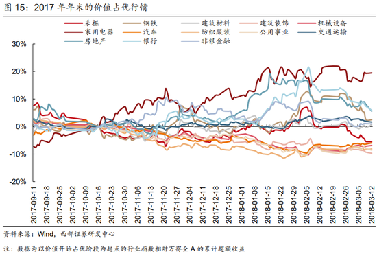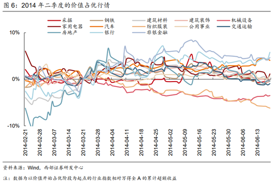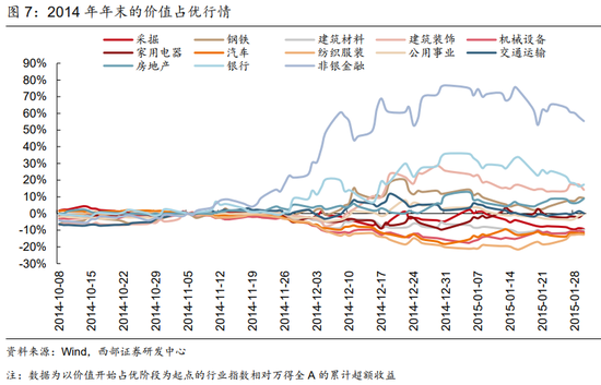 2014年出现过三次价值占优阶段,主要发生在3-5月,7-8月以及11-12月,“一带一路”催化价值行情。在经历了2013年的快速上涨后,2014年上半年以创业板为代表的成长板块阶段性走弱,叠加货币政策宽松后市场对于地产链的关注上升,价值和成长风格呈现交替占优。在2014年3月末至5月中旬期间A股先涨后跌,这一阶段创业板指表现弱于主板,相对而言房地产、建筑材料与银行板块率先引领价值板块取得超额收益,采掘随后也出现过阶段性走强。2014下半年A股市场开始走出低谷,7月23日至8月4日期间价值也出现过短期的相对强势,行情以非银金融、采掘、银行与钢铁为首。2014年11月21 日,央行自 2012年 7 月以来首次降息(一年期存款基准利率下调 0.25 个百分点至 2.75%,金融机构一年期贷款基准利率下调 0.4 个百分点至 5.6%),推动市场流动性预期的全面修正,A股主要指数全面上行。最先启动的受益于“一带一路”概念的建筑装饰、交通运输与公用事业,以及降息利好消息刺激下的券商板块。随后以券商为代表的非银金融一枝独秀,银行与建筑装饰表现强势。后来到了2015年货币政策进一步放松,叠加多项改革政策措施落地,中小与成长风格也显著走强,价值的相对优势转而收敛。
