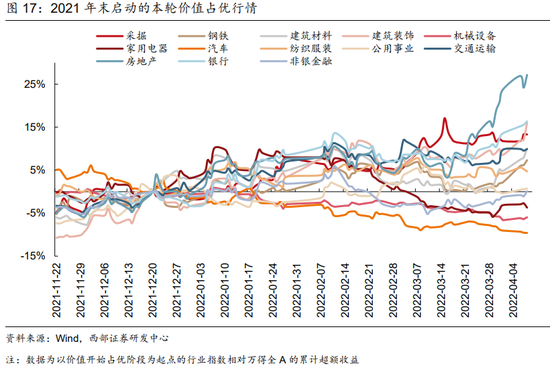 本轮价值风格占优始于2021年12月。稳增长预期强化金融地产主线,低估值风格占据上风。2021年12月“春季躁动”行情提前启动,央行进一步释放货币政策宽松信号,12月7日下调支农支小再贷款利率,12月15日宣布全面降准,12月20日下调1年期LPR报价,政策转向宽货币+宽信用。彼时市场开始转向“稳增长”主线,但中央经济工作会议结束后,市场对流动性与政策预期的博弈导致市场步入调整。2022年以来,伴随海外“类滞胀”压力下美联储开启加息周期,A股盈利整体承压,加上风险事件的冲击打压市场情绪,低估值策略相对占优。与此同时,随着国内经济压力显现,稳增长预期加码,加上各地地产政策出现松动,3.16金稳会释放维稳信号,地产、非银金融等行业显著跑赢。
