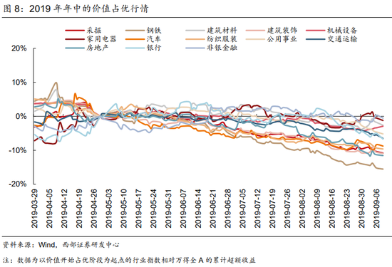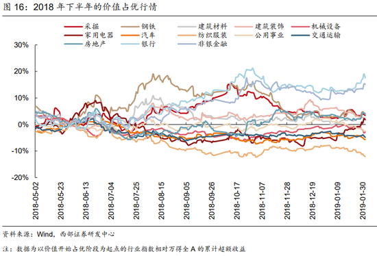 2017-2018年市场调整过程中有两轮价值占优行情,分别对应2017年10月至2月的第一轮调整和2018年下半年的第二轮调整,市场情绪低迷阶段价值相对强势。2017年下半年全球经济复苏背景下利率上行,这也是与其他阶段显著不同的点。2017年10月下旬,A股处于震荡格局,价值风格开始跑赢但超额收益并不显著,到了11月下旬伴随茅台股价格的理性回归与资管新规的出台,市场风险偏好下行,而价值相对优势凸显,价值板块中家用电器率先上涨并延续了强势表现。12月以后成长风格普遍休整,非银金融、地产与银行也有轮番演绎,成长风格中电气设备表现亮眼。2017年12月末起A股迎来反攻,价值风格的超额收益显著下降,但随着1月末海内外行情快速转向,市场风险情绪低迷阶段价值相对抗跌,直至2月9日以后A股市场触底反弹,价值风格才宣告步入休整期,成长则跑出了超额收益行情。随着中美贸易摩擦超预期升级,在5月29日美国宣布对华500亿美元商品加征关税次日后市场进入到快速下行阶段,2018下半年上证指数下跌了20%。即使利率下行也没能抵御风险偏好与盈利的恶化,普跌行情阶段价值相对占优,此轮行情呈现出从家用电器到非银金融,再到金融地产与钢铁行业的轮动;成长板块普遍低迷,军工与农林牧渔相对强势。直到2019年初市场从极度悲观情绪中走出,加上1月4日央行宣布全面降准,A股迎来普涨行情,价值成长共同演绎。