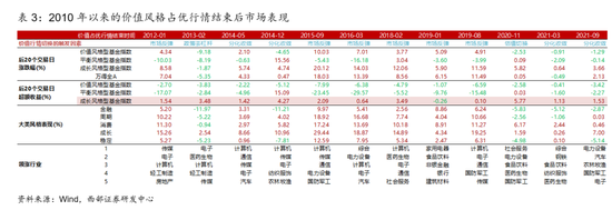 价值风格占优的终结往往源自流动预期修正,市场估值分化弥合和产业政策的调整,其后多数情况下市场转涨且成长占优。从历史上看,逆转价值占优行情的触发因素往往需要几个要素,包括政策信号转宽(例如2015年、2016年2月、2018年下半年以及2019年下半年风格切换均与流动性转松有关),经历较为充分调整后市场整体的企稳反弹(如2015年、2017-18年的市场调整后的反弹),风格与估值分化的收敛(如2014年与2021年),亦或是板块间相对基本面的变化(如2013年地产政策收紧与2021年9月周期品价格预期见顶)。在价值占优行情结束后的20个交易日内,万得全A平均涨跌幅为5.48%,成长风格型基金指数平均超额收益达到2.10%,价值风格型基金指数平均超额收益为-3.93%。