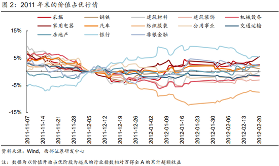 2011年12月至2012年1月A股整体下行,金融地产率先启动。在外有欧债危机,内有通胀压力的背景下,2011年A股市场整体表现不佳。2011年11月,国内通胀压力有所缓解,货币政策开始从紧缩转向放松,不过彼时市场对国际板传言感到恐慌,叠加全球经济形势不佳,A股步入下跌通道,银行、房地产、非银金融以及公用事业率先启动;11 月 30 日央行下调准备金率0.5%,随后价值板块取得相对超额收益(本文对于价值板块的定义为至少满足低市盈率、低市净率与高股息率三个标准中的两个),中后期家用电器、采掘板块跟随上扬。2012年1月6日第四次全国金融工作会议召开后股市信心明显修复,伴随春季躁动的启动以及流动性的边际宽松,成长风格开始接棒。
