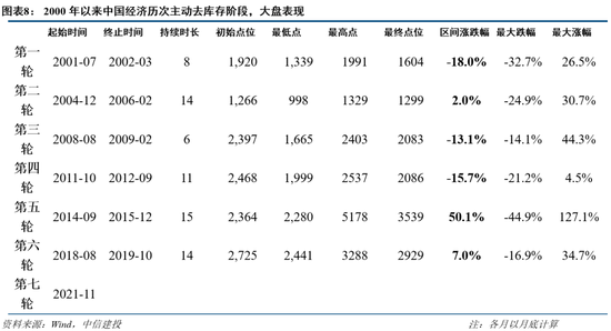 在历次主动去库存时期,A股市场通常以“下跌-探底-回升”的形式演绎,表现为熊市末尾、长期磨底和牛市初期的多个阶段。持续时间较长的主动去库存阶段甚至会将熊市和牛市演绎的较为充分。例如2004年底开启的第二轮主动去库存,A股在7个月后见底,随后开启了一轮大牛市。2014-2015年的先大涨后大跌情况则较为罕见,属于特殊情况。