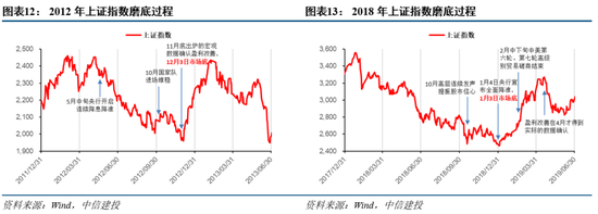 重点复盘2012年和2018年这两次经济下行背景下的市场磨底期,可以发现市场底的出现需要明确的盈利底信号的具备,这可以是宏观和市场层面的直观数据验证,也可以是强烈的基本面改善预期。