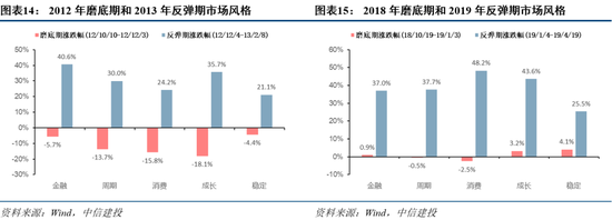从市场风格的角度来看,磨底期金融和稳定风格的相对超额收益更高,反弹期里成长风格较为强劲,反弹前期早周期品种(煤炭、建材、机械等)的市场表现相对靠前。