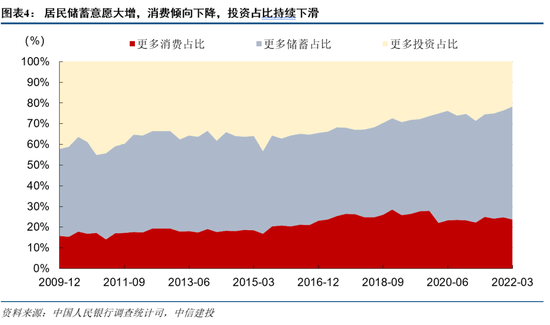 疫情对消费意愿的影响也愈发明显。据2022 年第一季度城镇储户问卷调查报告,倾向于“更多消费”的居民占23.7%,比上季减少1.0个百分点;倾向于“更多储蓄”的居民占54.7%,比上季增加2.9个百分点,创2002年以来新高;倾向于“更多投资”的居民占21.6%,比上季减少1.9个百分点。预防性储蓄意愿上升,挤压消费和投资的趋势仍在继续。