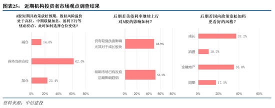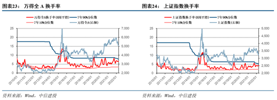 从投资者情绪的角度而言,市场换手率10%、90%的历史分位数具备一定的指导意义。这样来看,目前市场换手率仍然较高。这一现象也是出于市场对经济和企业盈利下行、美联储后续大概率加快货币正常化节奏以及国际地缘政治事件不确定性等内外部扰动的担忧,并继续期待稳增长政策效果等因素所致,因此可能还需继续等待进行充分换手。从近期我们进行的机构投资者市场观点调查结果来看,目前乐观者(23.4%)的比例略超悲观者(14.6%),但大多数机构投资者对市场仍然持有中性态度(62.0%),后市相对更看好成长(37.2%)和金融地产(35.0%)风格。
