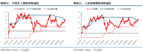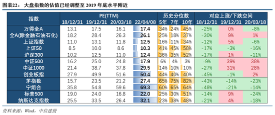 从股权风险溢价的角度来看,股票资产的相对性价比已经突显。目前万得全A和上证指数的隐含风险溢价水平,已经位于近7年90%分位数水平上方。从历史来看,2018年底和2020年一季度时,市场也是在此位置附近见底,随后开启反弹。但2012年时,基本面持续疲弱导致投资者不断期待政策力度和数据验证,市场长期阴跌震荡磨底,股权风险溢价调整至90%分位数上方。即使当下我们所面临的基本面和流动性环境均有压力,但也难言比2018年和2020年疫情初始时更差。目前大盘指数的估值已经调整至疫情前的2019年底水平附近,因此在当前位置股票资产的长期配置价值。