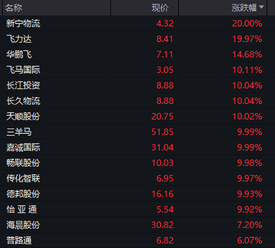 其他物流股纷纷跟进。截至午间休市,“航空货运与物流”板块整体上涨2.31%,新宁物流、飞力达、飞马国际(维权)、长久物流等多股涨停。