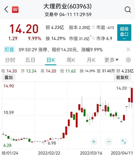 受利好消息刺激,中药板块近期表现强势。作为本轮中药股领涨龙头之一,大理药业此前股价收获多个涨停,3月以来累计涨幅达到70%。