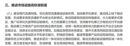 意见在“推进市场设施高标准联通”部分提出,要建设现代流通网络。具体包括:优化商贸流通基础设施布局,加快数字化建设,推动线上线下融合发展,形成更多商贸流通新平台新业态新模式。推动国家物流枢纽网络建设,大力发展多式联运,推广标准化托盘带板运输模式。大力发展第三方物流,支持数字化第三方物流交付平台建设,推动第三方物流产业科技和商业模式创新,培育一批有全球影响力的数字化平台企业和供应链企业,促进全社会物流降本增效。加强应急物流体系建设,提升灾害高风险区域交通运输设施、物流站点等设防水平和承灾能力,积极防范粮食、能源等重要产品供应短缺风险。完善国家综合立体交通网,推进多层次一体化综合交通枢纽建设,推动交通运输设施跨区域一体化发展。建立健全城乡融合、区域联通、安全高效的电信、能源等基础设施网络。