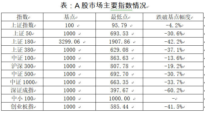 “从以往经验看,A股市场主要代表性指数如上证综指、深成指、创业板指都出现过跌破基点的现象,但长期来看,跌破某一点位不改后期向上的走势。”上述市场人士称。