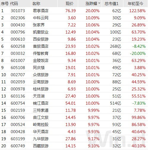 从涨幅居首的社会服务板块来看,多为旅游酒店类公司,其中, 君亭酒店 20CM涨停, 张家界 、 凯撒旅业 、 西安旅游 、 首旅酒店 、 金陵饭店 、 同庆楼 、 众信旅游 、 云南旅游 、 桂林旅游 、 天目湖 、 锦江酒店 、 三特索道 、 曲江文旅 、 岭南控股 、 华天酒店 等多股集体涨停。