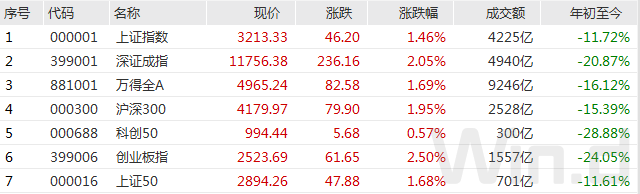 截至4月12日收盘, 上证指数 涨1.46%报收于3213.33点;深成指涨2.05%报收于11756.38点; 创业板指 涨2.50%报收于2523.69点, 万得全A 总成交9246亿元。