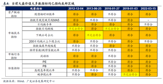 截止22年4月13日,22年3月15日是本轮下跌中大多数宽基指数的最低点位出现时点。从资产联动指标、技术指标、市场行为指标和估值指标等四个角度的市场静态特征来看,大盘价值指数在2022年3月15日已经具备明显的底部特征,13大指标中有10大指标均已指向大盘价值已经处于赔率极为吸引的位置。
