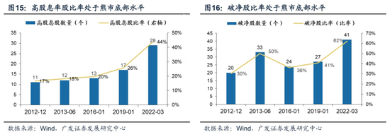 2022年3月15日股息率大于5%的股票数量为29只,占比44%,四次熊市底部时期为11-17只,占比在17%到26%之间。当前高股息率股票比率显著高于历史熊市底部区间,满足底部特征。