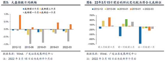 从大盘指数日均跌幅看,底部形成前最后1个月指数日均跌幅在-0.3%至-1.0%,且相比前3个月、前6个月跌幅均有所放大;同时在底部右侧1个月,指数由跌转账。22年3月15日前1个月跌幅有所放大,跌幅环比增速显著上升,并在底部后明显反转。