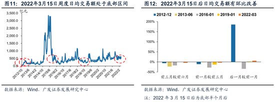 从历史经验来看,大底附近周度日均成交额一般处于区间底部。A股4次大底中,成交额均有显著下降。交易额同比变化方面,除2016年1月底外,其他三次底部后一个月较底部前一个月日均交易额同比均有所上升。2022年3月15日至4月12日日均成交额较底部一个月前同比增长6.3%,符合底部特征。